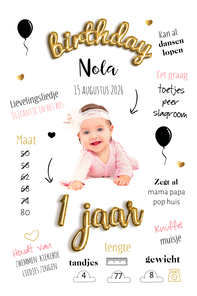 Originele uitnodiging met eigen foto voor een 1e verjaardag. Een kaartje met op de voorzijde veel tekst, leuke weetjes en mijlpalen van de jarige. "1 jaar" en "birthday" staan in feestelijke goudkleurige ballon foil letters. Er is gebruik gemaakt van handlettering en typografie. De slingers, ballonnen en hartjes maken de kaart compleet. De kleuren en teksten zijn gemakkelijk aan te passen.