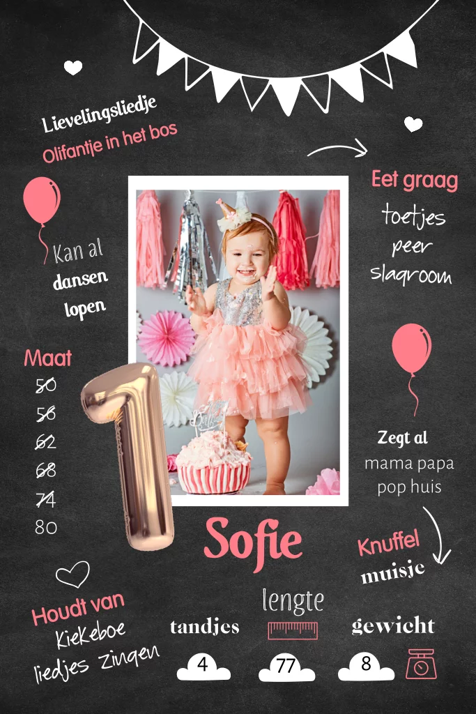 Originele uitnodiging met eigen foto op een krijtbord achtergrond. Een hip kaartje met veel tekst, leuke weetjes en mijlpalen van de jarige. Het cijfer 1 in feestelijke ballon foil. De slingers, ballonnen en hartjes maken de kaart compleet. De kleuren en teksten zijn gemakkelijk aan te passen.