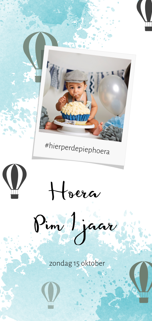 Het versturen van deze uitnodiging maakt het al tot een feest! Op de kaart staan luchtballonnen en de foto maakt het heel persoonlijk.