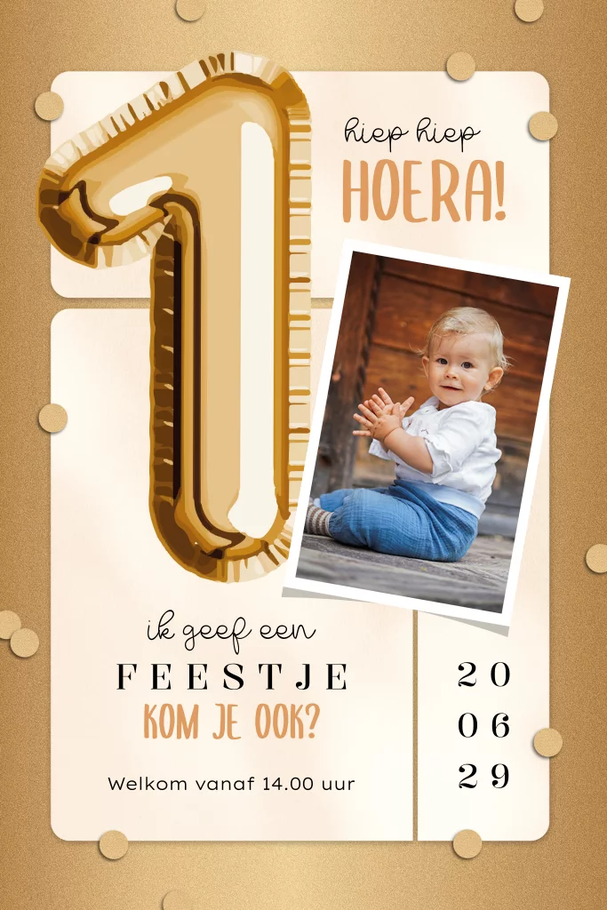 Uitnodiging kinderfeestje 1 jaar met ballon en foto