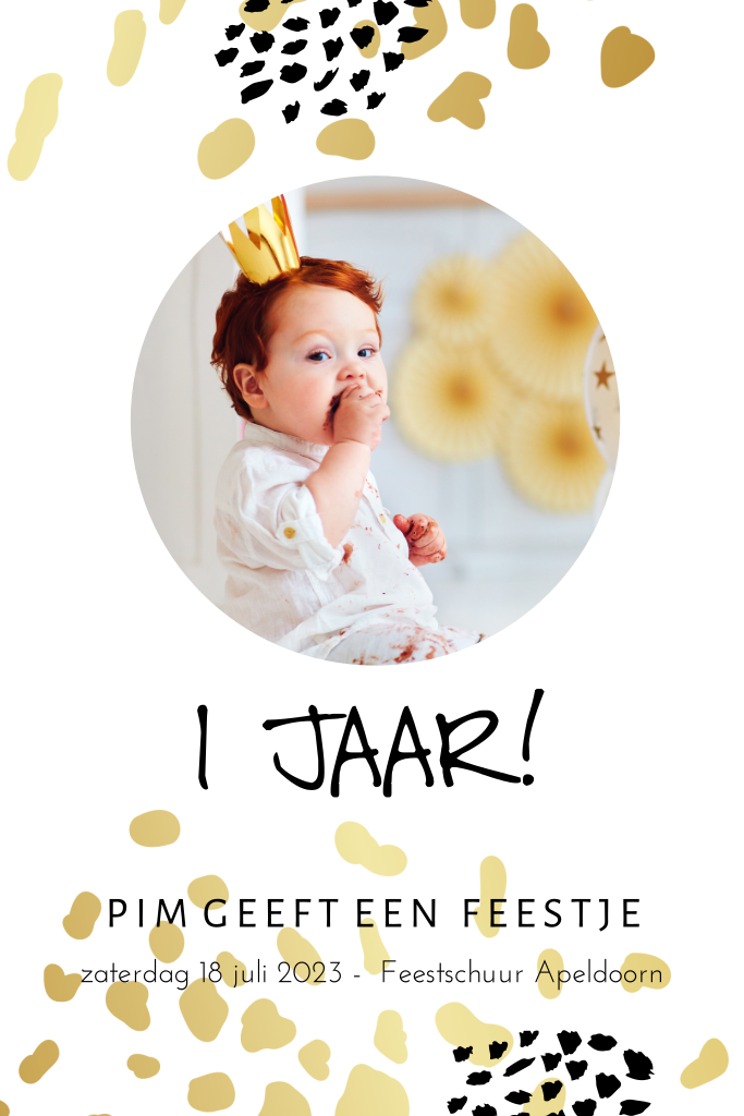 Uitnodiging voor een kinderfeest. Op deze kaart is een foto in een cirkel geplaatst. De kaart is gedecoreerd met goudkleurige en zwarte dierenpatroontjes.