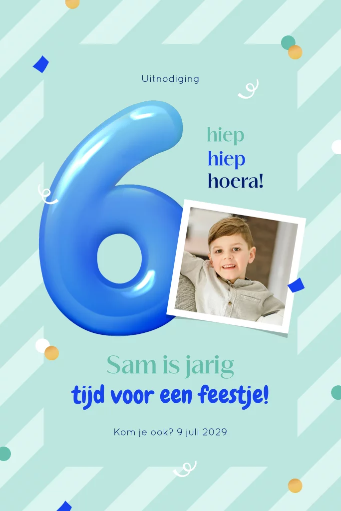 Een feestelijke, opvallende uitnodiging met confetti! Op deze kaart zie je het cijfer 6 in een grote ballon geïllustreerd met ruimte voor een eigen foto van de jarige. Met de petrol envelopkleur maak je deze kinderfeest uitnodiging voor een jongen helemaal in stijl af.