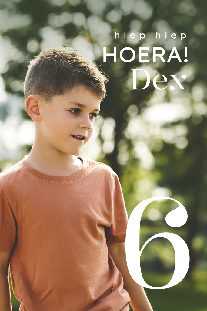 Uitnodiging voor een kinderverjaardag van een jongen met eigen foto en leeftijd. Pas de tekst, foto en de leeftijd eenvoudig aan in de editor.