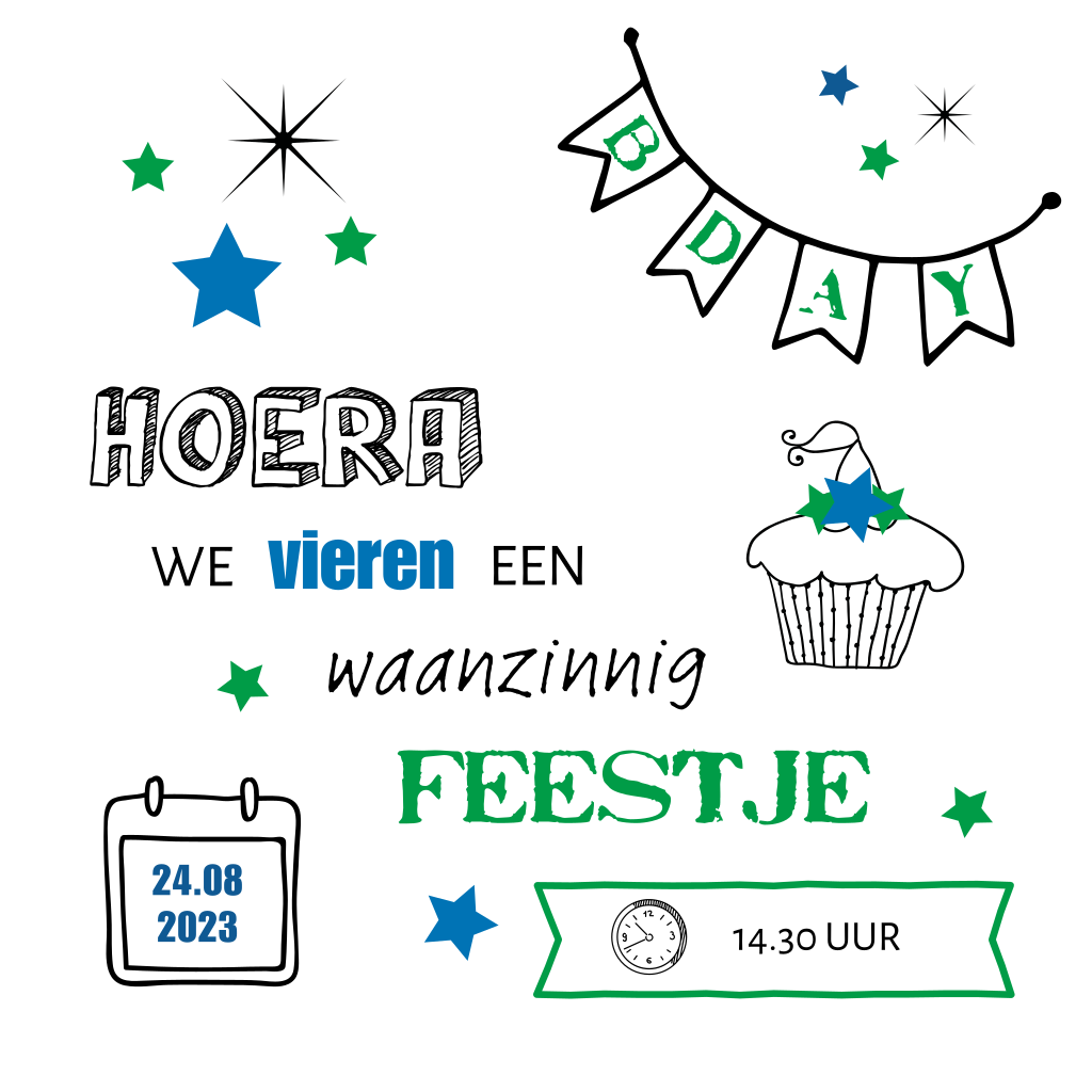 Vrolijke kaart voor een kinderfeest met eigen foto van de jarige. Op de voorzijde staan feestelijk elementen, zoals een slinger, taart en sterren. Op de achterzijde is een foto toegevoegd.