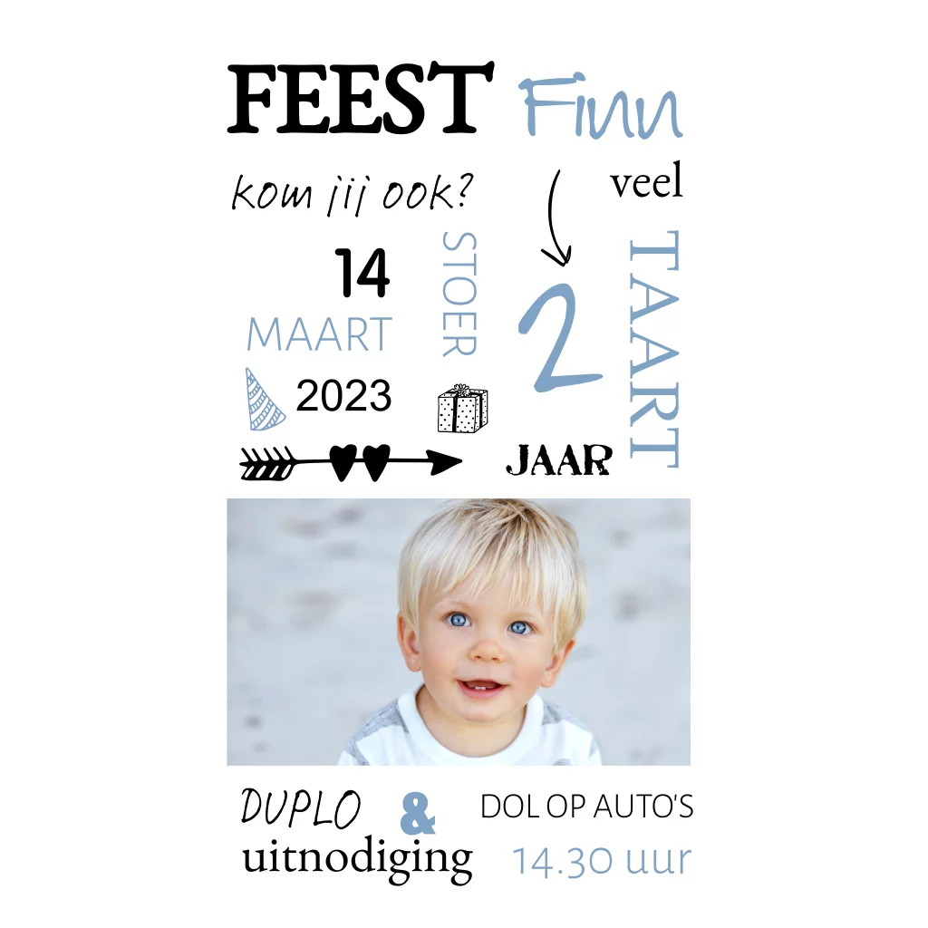 Hippe foto uitnodiging voor een kinderfeestje voor een jongen. Op dit kaartje is gebruikt gemaakt van handlettering en typografie. De foto van de jarige maakt het feest compleet.