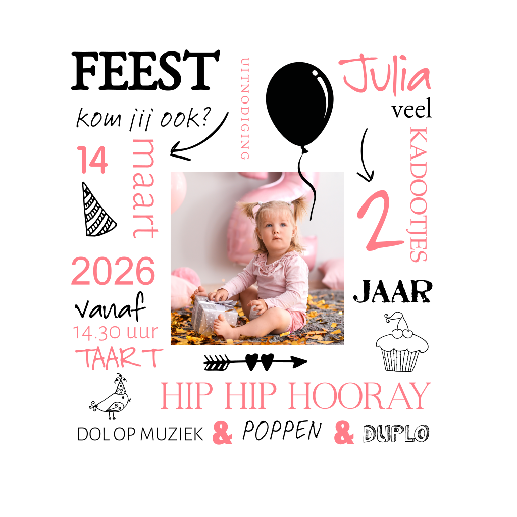 Hippe uitnodiging voor een kinderfeestje voor een meisje. Op dit foto kaartje is gebruikt gemaakt van handlettering en typografie.