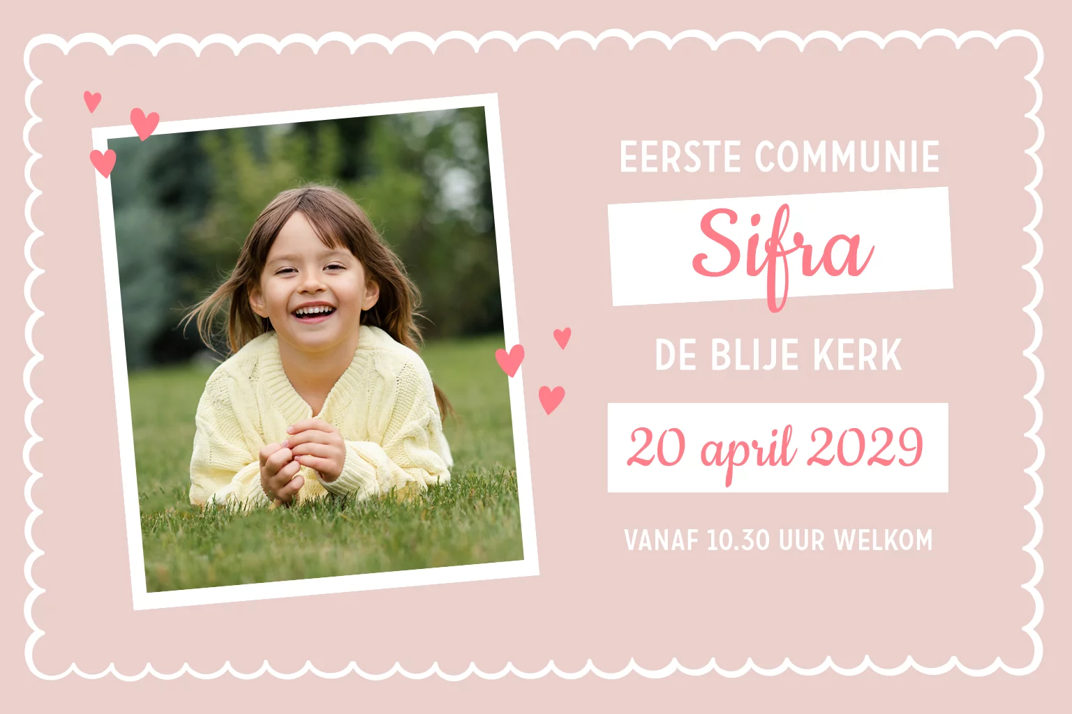 Schattige uitnodiging voor een eerste communiefeestje van je dochter. Dit roze kaartje heeft een subtiele, witte golvende kader en er is ruimte voor foto. De foto is omringt met hartjes in een felroze kleur. Pas de kleuren, lettertypes en teksten makkelijk zelf aan in de online editor.