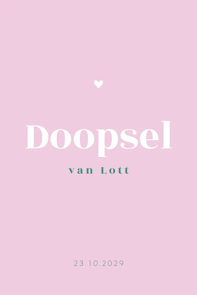 Uitnodiging voor een doopsel van een meisje met roze achtergrond en mat goudfolie hartje en de tekst 'doopsel'. Je kunt deze uitnodiging zelf gemakkelijk bewerken, opslaan en bestellen. Extra handig: Laat je uitnodigingen voor de doopsel van je dochter met onze verzendservice direct vanaf de drukkerij versturen. Vragen of wensen? Laat het gerust weten, wij helpen je graag