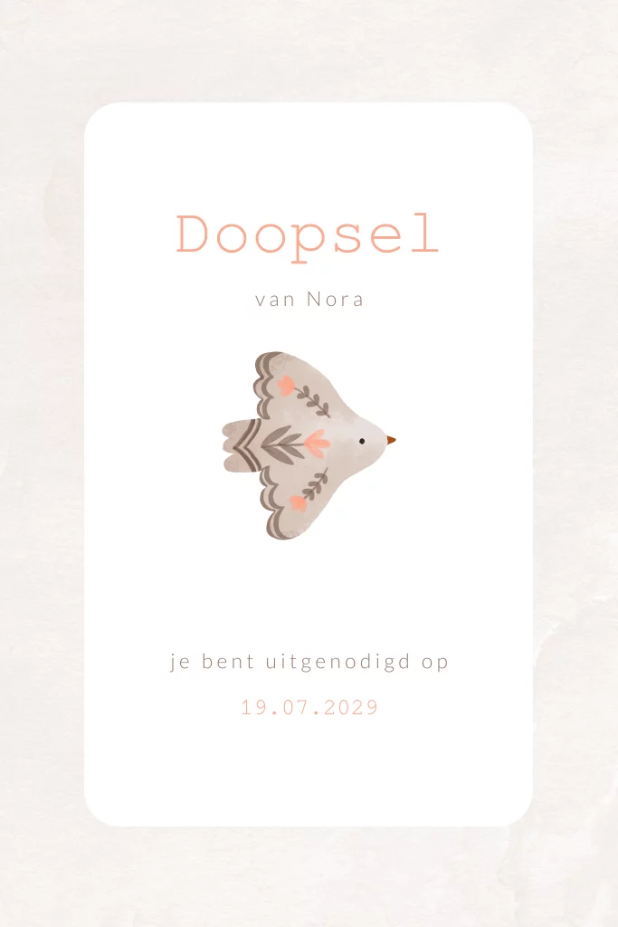 Een rustige uitnodiging voor het doopsel van je kindje. Dit kaartje heeft een beige soft look kader en op dit kaartje staat een duif. Maak het geheel af met een bijpassende sluitzegel.