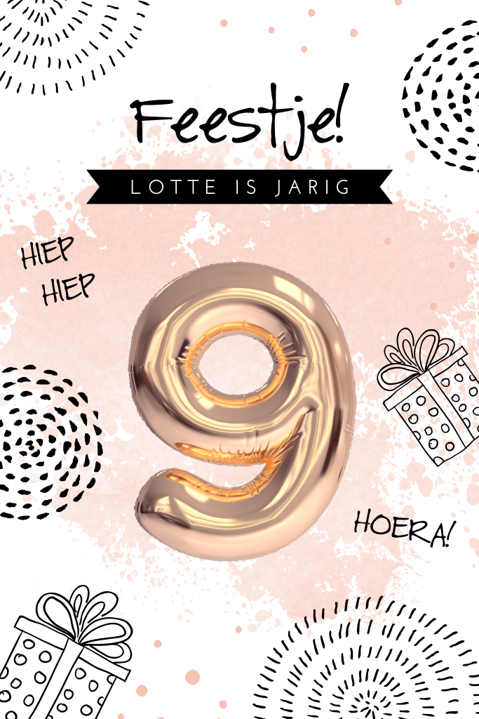 Trendy verjaardagskaartje voor een meisje. Op deze uitnodiging staat een balloncijfer en veel cirkels in diverse patronen. Op de achtergrond een roze aquarel. Het cijfer is gemakkelijk aan te passen naar een andere leeftijd.