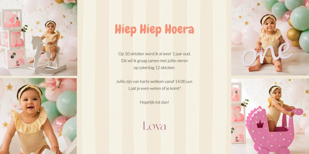 Vrolijke uitnodiging voor de eerste verjaardag van je kind. Deze kinderfeest uitnodiging is bijzonder door de luikdeurtjes. De uitnodiging heeft beige strepen met vrolijke confetti en cijferballon in 1 jaar. Zet een paar lieve foto's van je kleine meid op de uitnodiging om deze zo nog persoonlijker te maken. Bewerk deze theatervouw uitnodiging eenvoudig in de editor. Bekijk alle opties in onze handige editor en ga aan de slag!