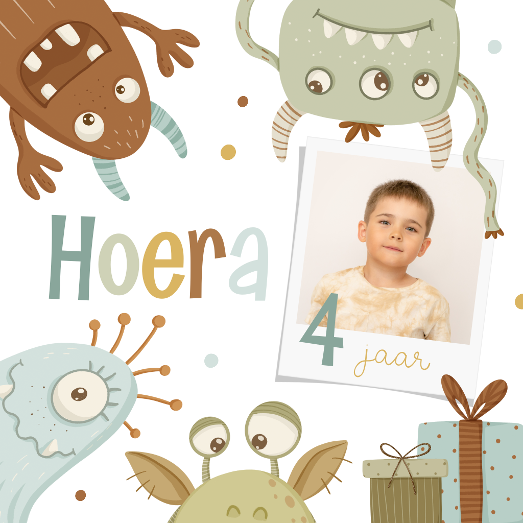 Vrolijke uitnodiging voor een kinderfeest met gekke monsters, confetti en cadeautjes. Zet een foto van je kind in het kader en pas de leeftijd naar wens aan.