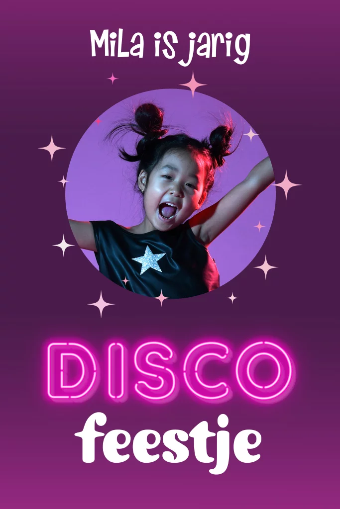 Wanneer je kind een jaar ouder wordt, is het tijd voor een groot kinderfeestje! Een disco party is een geweldige manier om dit te vieren. Deze uitnodigingskaart met paarse kleuren en neon tekst is perfect voor een meisje en is eenvoudig aan te passen. Voeg een eigen foto toe en maak zo je eigen persoonlijke disco uitnodiging.