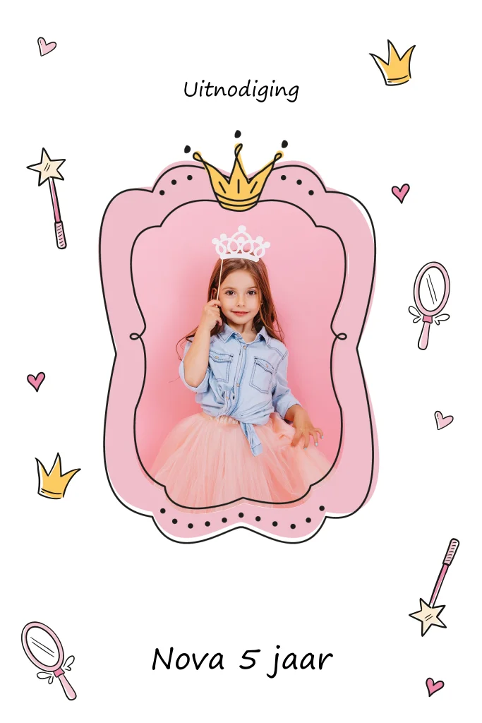 Vier het feestje van je prinsesje met deze schitterende uitnodigingskaart met holografisch foliedruk. Met verschillende illustraties van een kroontje, toverstaf, spiegeltje en hartjes en de mogelijkheid om een eigen foto toe te voegen, maak je deze uitnodiging helemaal uniek. Pas deze uitnodiging voor een prinsessenfeest naar eigen wens aan in de online editor. De lichtroze envelop maakt het geheel helemaal af.