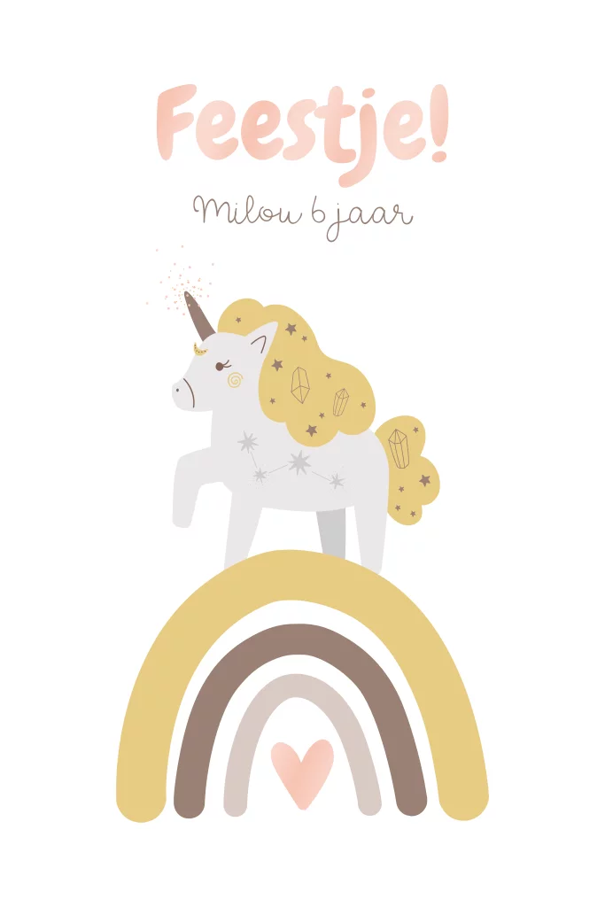 Unicorn uitnodiging voor een kinderfeestje. Op deze uitnodiging voor een kinderfeestje vind je alles wat je nodig hebt: een vrolijke unicorn met regenboog en hartje. Helemaal geschikt voor een meisje die van eenhoorns houdt en een eenhoorn kinderfeestje geeft! Extra bijzonder aan deze uitnodiging zijn de ronde hoeken en de hoogglans. De spot-UV hoogglans lak geeft een mooie glans en diepte aan de kaart. De teksten zijn gemakkelijk aan te passen, net zoals de leeftijd op het kaartje.