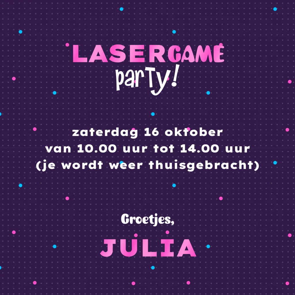 Vier je kinderverjaardag in stijl met deze prachtige uitnodiging voor een lasergame party! Deze uitnodiging is voorzien van een opvallende achtergrond met allerlei lasergame elementen. Verder is het woord laser game in hoogglans vormgegeven en dit zorgt voor een tof effect op de kaart! Pas deze uitnodiging naar eigen wens aan in de online editor.