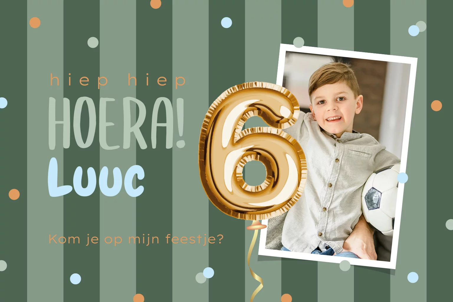Een feestelijke kinderfeestje uitnodiging voor een jongen! Deze uitnodiging heeft een gestreepte achtergrond, gekleurde confetti en een grote geïllustreerde ballon met het getal 6 erop. Pas deze vrolijke uitnodiging naar eigen wens aan in de online editor. De ronde hoeken en de foto van de jarige zorgen voor een speels effect. Hulp nodig? We helpen je graag!