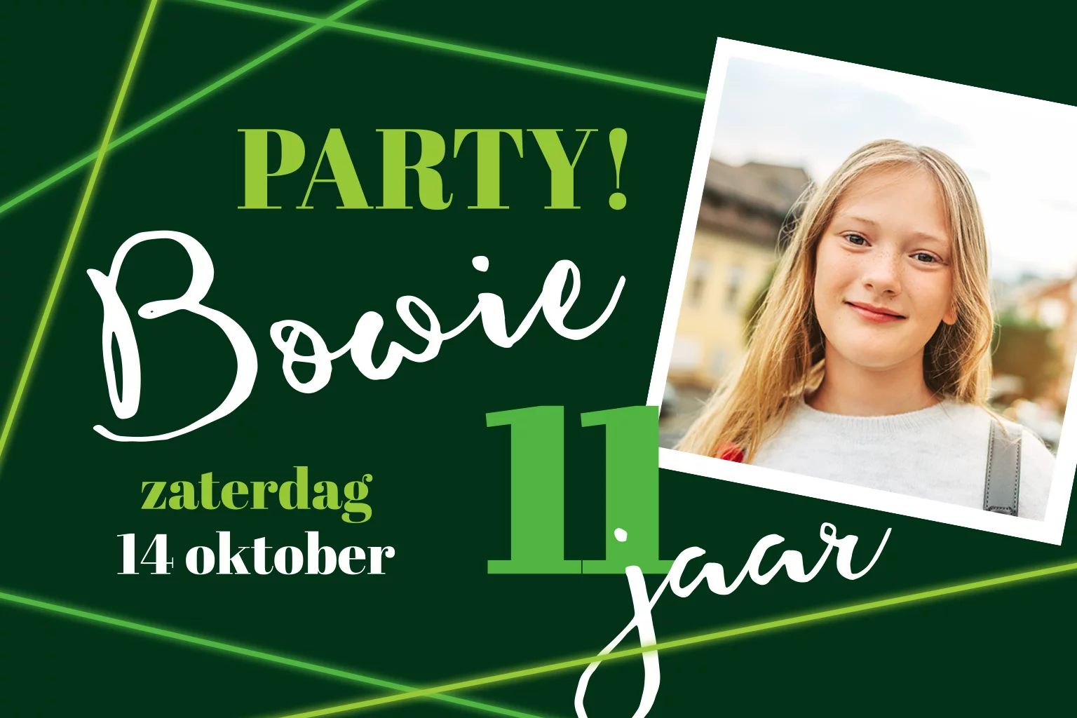 Stoere uitnodiging voor een lasergame kinderfeestje vol actie en avontuur. Met een cool ontwerp met groene lasers en de mogelijkheid om je eigen foto toe te voegen, maak je in een handomdraai een persoonlijke en stoere uitnodiging. Deze verjaardag uitnodiging kun je eenvoudig aanpassen in onze online editor. Bestel vandaag nog en zorg ervoor dat het kinderfeestje een spetterend succes wordt!