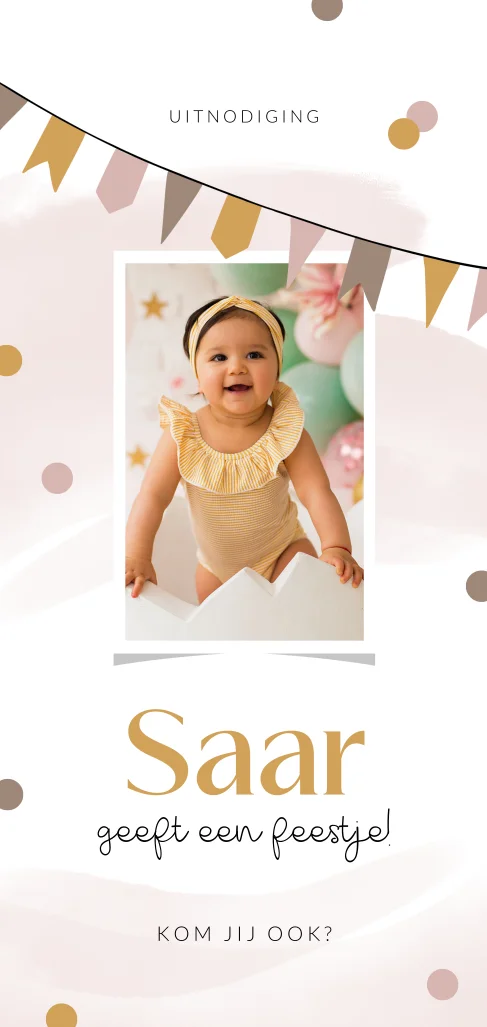 Hippe uitnodiging voor een kinderverjaardag voor een meisje met twee foto's, watercolor achtergrond, slingers en confetti.