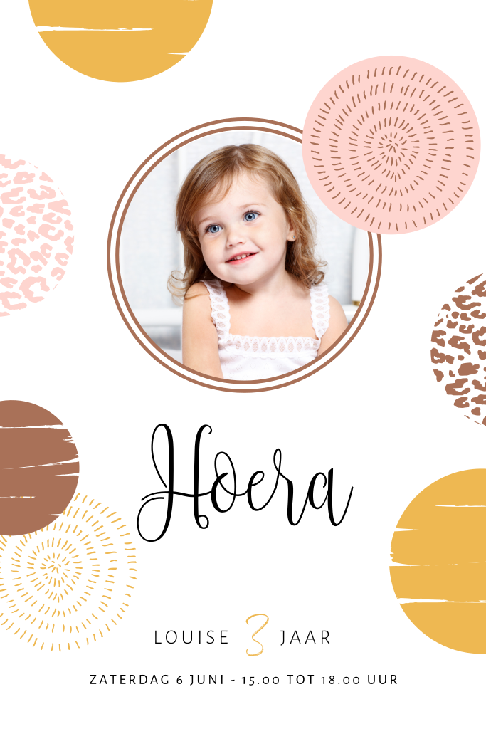 Trendy verjaardagskaartje voor een meisje. Op deze uitnodiging staat een eigen foto en veel cirkels in diverse patronen.