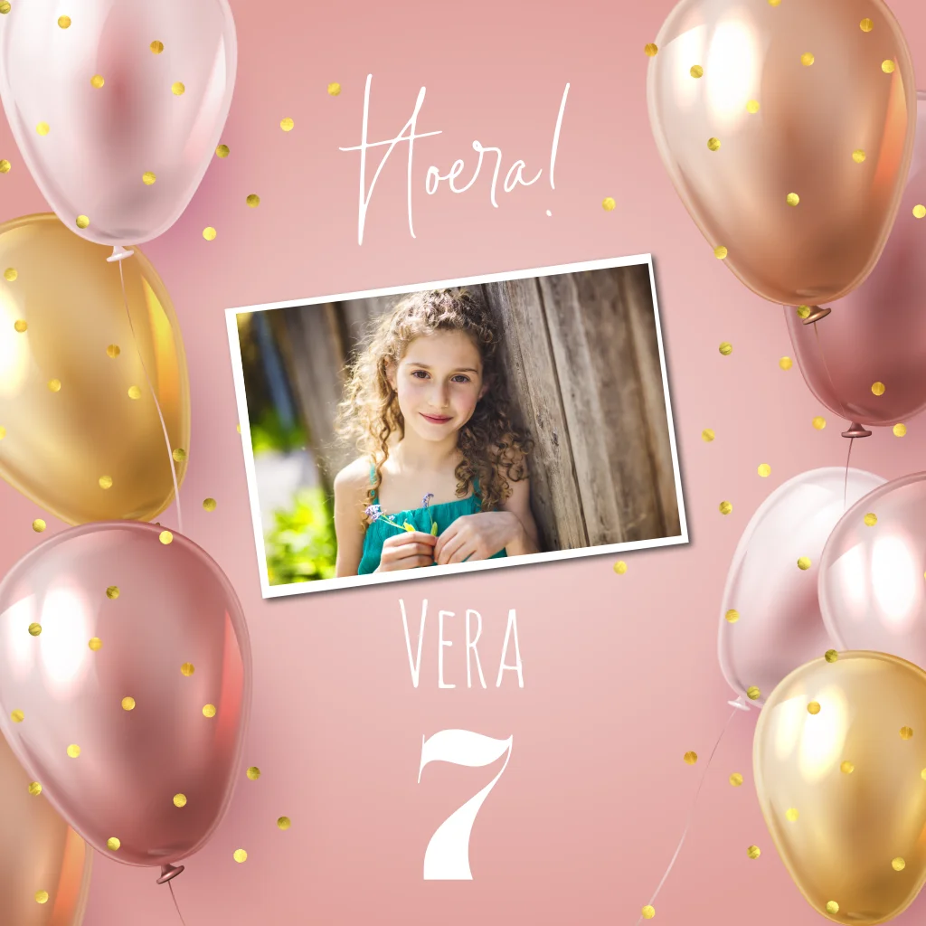 Feestelijke uitnodiging voor een kinder verjaardag. Op dit kaartje staan vrolijke roze en gouden ballonnen. Voeg een leuke foto toe om je eigen persoonlijke uitnodiging te maken. De leeftijd is gemakkelijk aan te passen naar andere getallen.