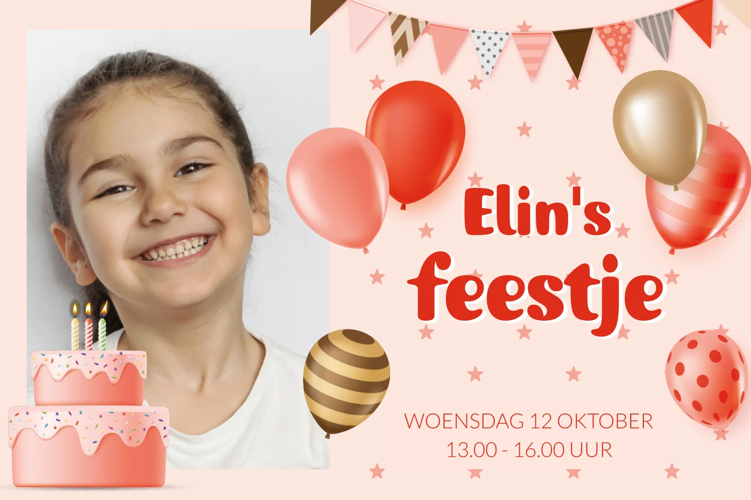 Tijd voor een kinderfeestje? Kies dan voor deze uitnodigingskaart! Deze uitnodiging voor een meisje bevat allerlei feestelijke elementen zoals een taart, ballonnen en slingers. Voeg een eigen foto van de jarige toe voor de persoonlijke touch in onze online editor. Wie nodig jij allemaal uit?