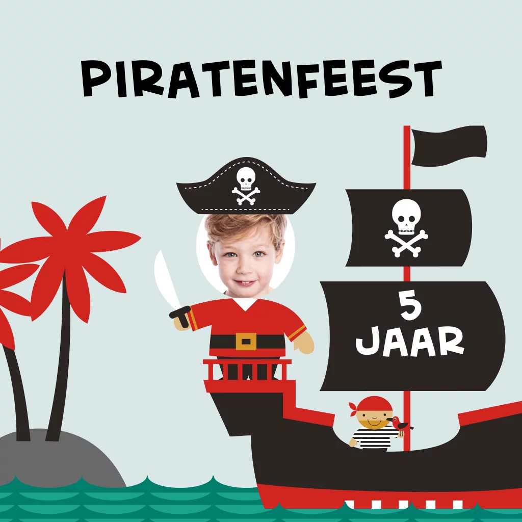 Maak van de vijfde verjaardag van je kind een onvergetelijke gebeurtenis met deze vrolijke uitnodiging voor een kinderfeestje. Met een kleurrijk ontwerp en een piratenfeest thema, is deze uitnodiging perfect voor een feestje vol plezier en avontuur. De kaart is geïllustreerd met een stoer ontwerp van een piratenschip op zee. Helemaal leuk is dat je kindje zelf de piraat mag zijn op dit kaartje! Voeg daarom een eigen foto toe. Dit doe je eenvoudig in de editor. Pas hier ook gemakkelijk de teksten aan.