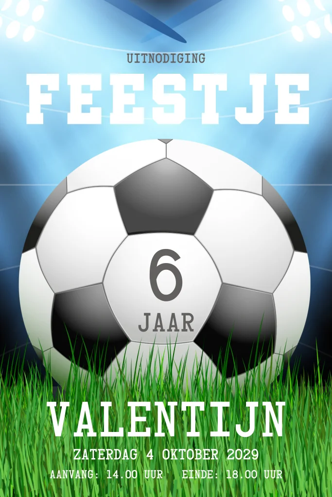 Op zoek naar een sportieve uitnodiging voor een kinderfeestje? Op deze uitnodiging voor een kinderfeestje zie je een voetbal met leeftijd erop in het gras liggen. Helemaal geschikt voor een jongen die gek is van voetballen. De teksten zijn gemakkelijk aan te passen, net zoals de leeftijd op het kaartje.