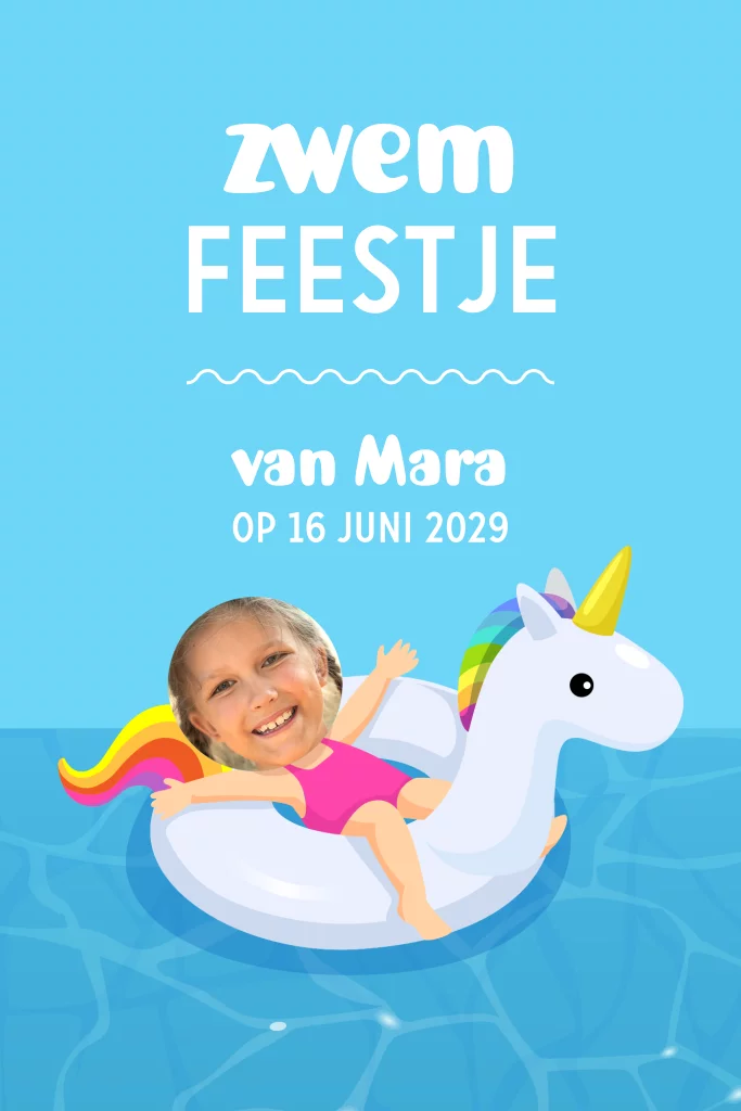 Kinderfeest uitnodiging zwemfeestje met eenhoorn zwemband en foto