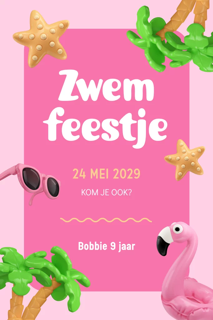 Uitnodiging zwemfeestje voor een kinderverjaardag! Deze zomerse uitnodiging heeft felle roze kleuren met palmbomen, flamingo's, zeesterren en een zonnebril. Pas kleuren en lettertypes naar eigen wens aan in onze online editor om er een persoonlijke uitnodiging van te maken. Hulp nodig bij het maken van een zwemfeestje uitnodiging? Ons team staat voor je klaar!