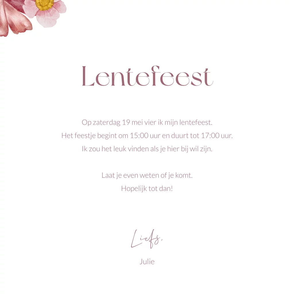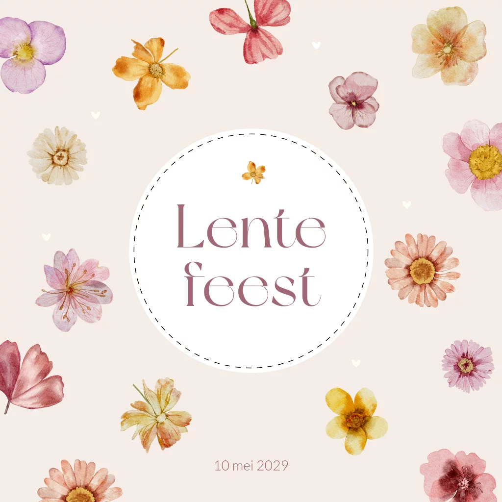 Vrolijke uitnodiging voor een lentefeest! Deze uitnodiging heeft een bloemenpatroon in verschillende kleuren en de achtergrond is beige. De tekst staat in een witte cirkel op het kaartje. Pas dit kaartje naar eigen wensen aan.