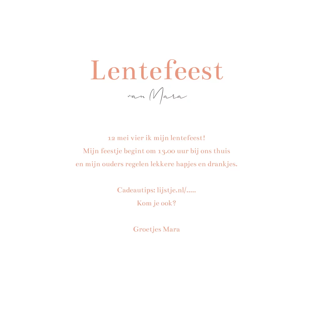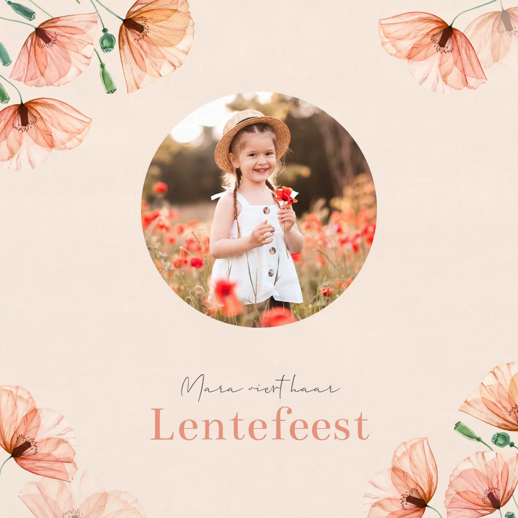 Uitnodiging voor een lentefeest voor een meisje. Op dit kaartje staan mooie aquarel klaprozen, de achtergrond heeft een zacht roze / beige kleur. Op het kaartje is ruimte voor een eigen foto. Dit kaartje kun je naar je eigen smaak aanpassen in de editor.