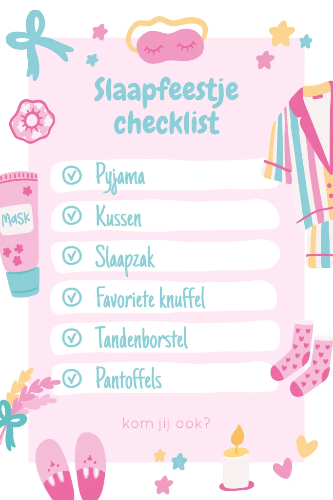 Slaapfeestje checklist! Nodig al je vrienden en vriendinnen uit met deze checklist voor een fantastisch slaapfeestje. Pas het kaartje naar eigen smaak aan in onze online editor. Deze kaart bevat allerlei leuke illustraties die bij een slaapfeestje horen zoals pantoffels, sokken, pyjama en een gezichtsmasker. Tijd voor een gezellige sleepover!