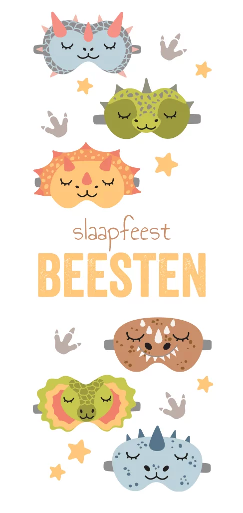 Uitnodiging voor een kinderfeest met slaapmaskers van dino's met pootafdrukken. Perfect voor een slaapfeestje met al je vriendjes en vriendinnetjes! Deze verjaardag uitnodiging is vrolijk met de tekst 'slaapfeest beesten'. Pas de teksten, lettertypen en kleuren gemakkelijk aan in de editor.