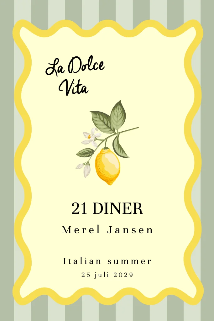 Feestelijke uitnodiging voor een 21 diner! Op de achtergrond van deze kaart een gestreepte achtergrond met daarvoor een golvend kader met een fantastische citroen in het midden. Helemaal in Italiaanse sferen! Teksten en kleuren kun je gemakkelijk aanpassen in onze online editor. Proost samen op een onvergetelijk diner!