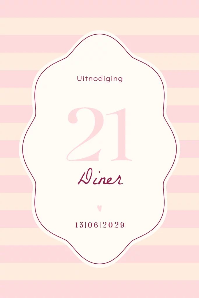 Een pastelkleur uitnodigingskaart voor een 21 diner! Op deze kaart zie je een speels kader met daarin de tekst 'Uitnodiging 21 diner' staan. Om het kader heen zie je een pastelkleur gestreept patroon in roze kleurtinten. Deze uitnodiging is geheel naar eigen smaak aan te passen in onze online editor. Maak indruk op je gasten met deze uitnodiging en maak er een fantastisch diner van.