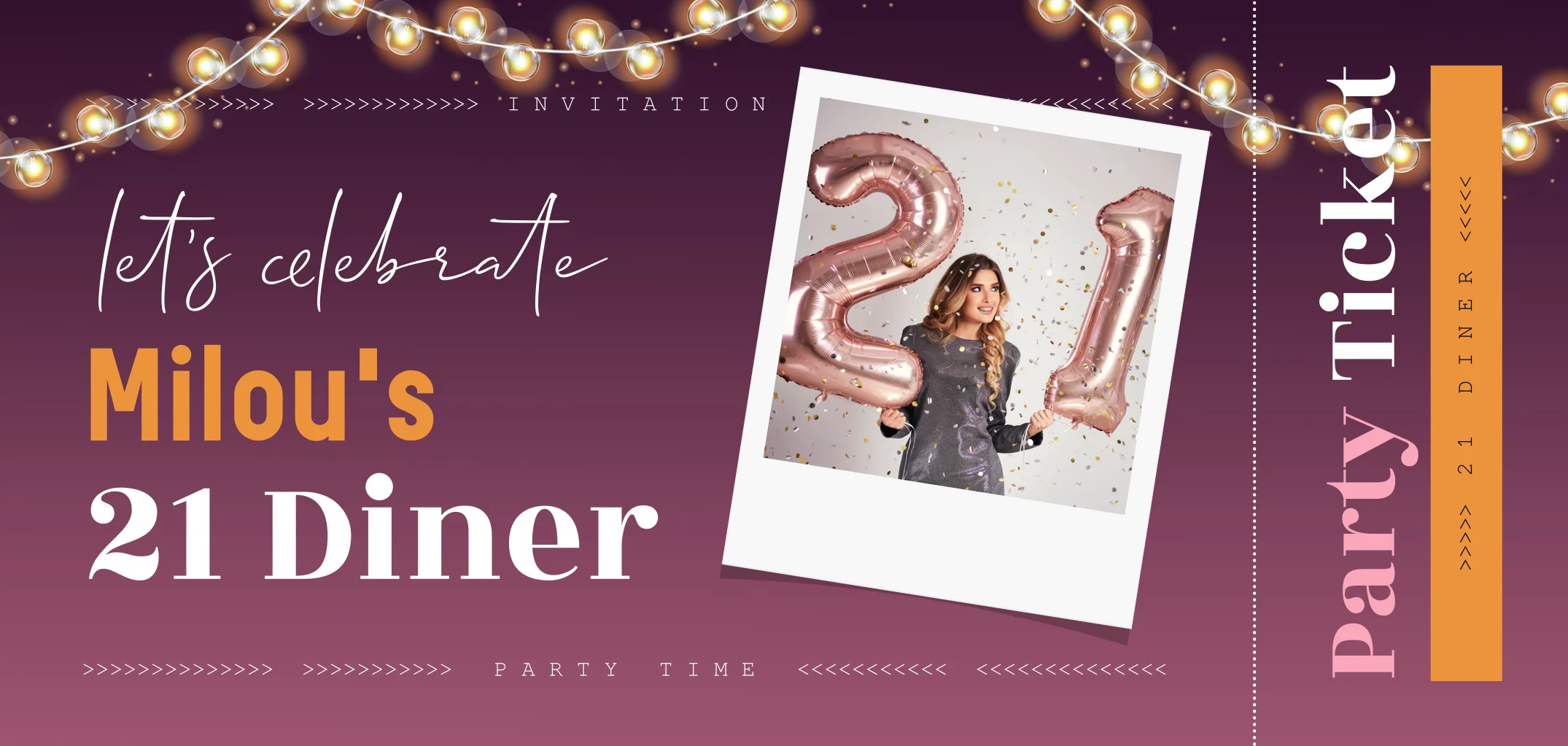 Hippe ticket uitnodiging voor een 21 diner. Wordt jij binnenkort 21 jaar? Party time! Vier je verjaardag en nodig al je vriendinnen uit met deze trendy verjaardaguitnodiging in ticketvorm, helemaal volgens de nieuwste trend van nu! De lampenslinger en rood paarse kleurverloop geven een feestelijke uitstraling aan deze 21 diner uitnodiging. Extra leuk aan deze party ticket is dat je de kleur naar elke gewenste kleur kunt aanpassen zodat deze helemaal naar je eigen wens en smaak is. Zet in het kader een feestelijke foto van jezelf en geef zo een persoonlijke touch aan deze hippe ticket uitnodiging.