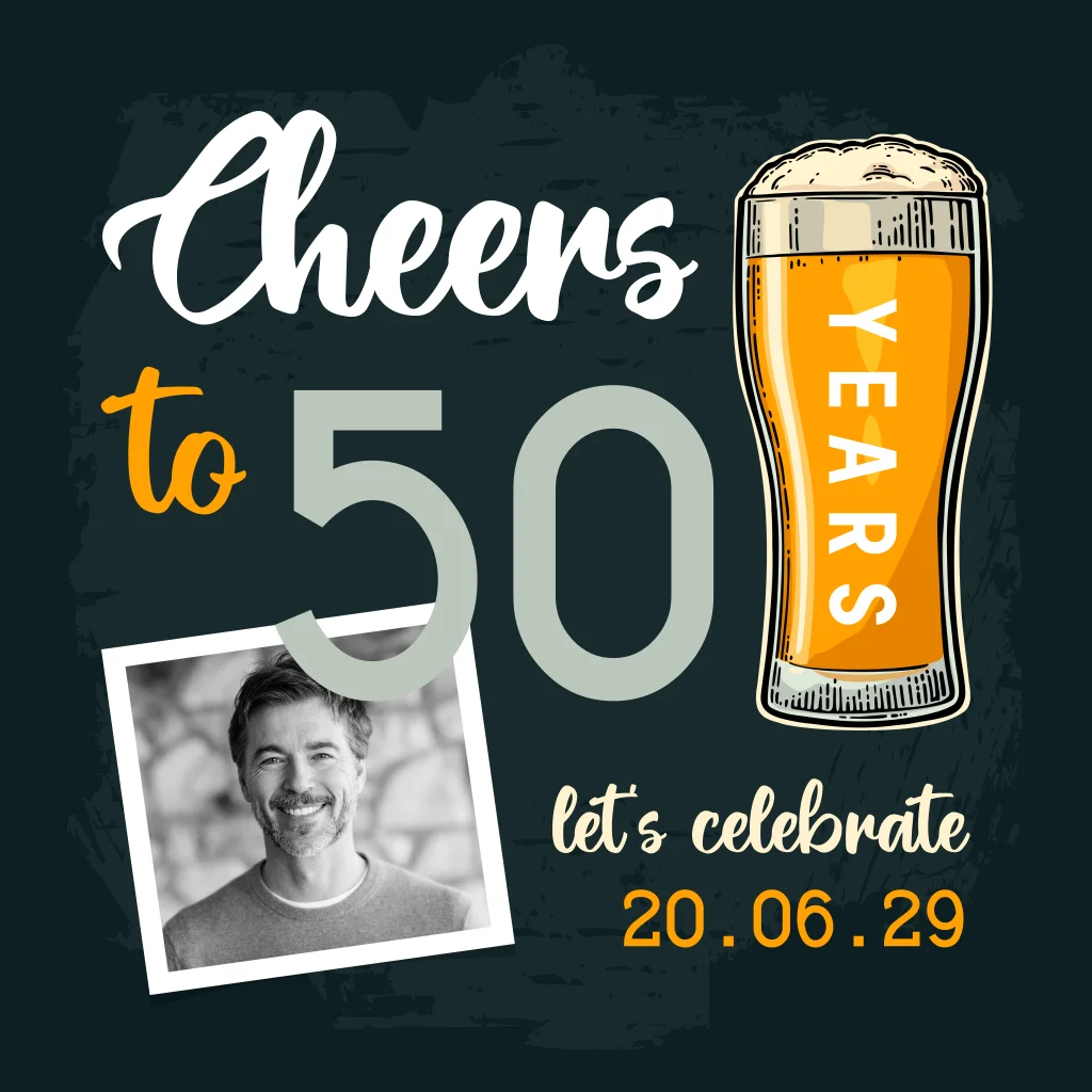 Cheers to 50 years! Stoere verjaardag uitnodigingskaart voor een 50ste verjaardag. Op deze kaart een zwarte achtergrond met verschillende lettertypes en een groot bierglas. Zet in het kader je eigen foto.