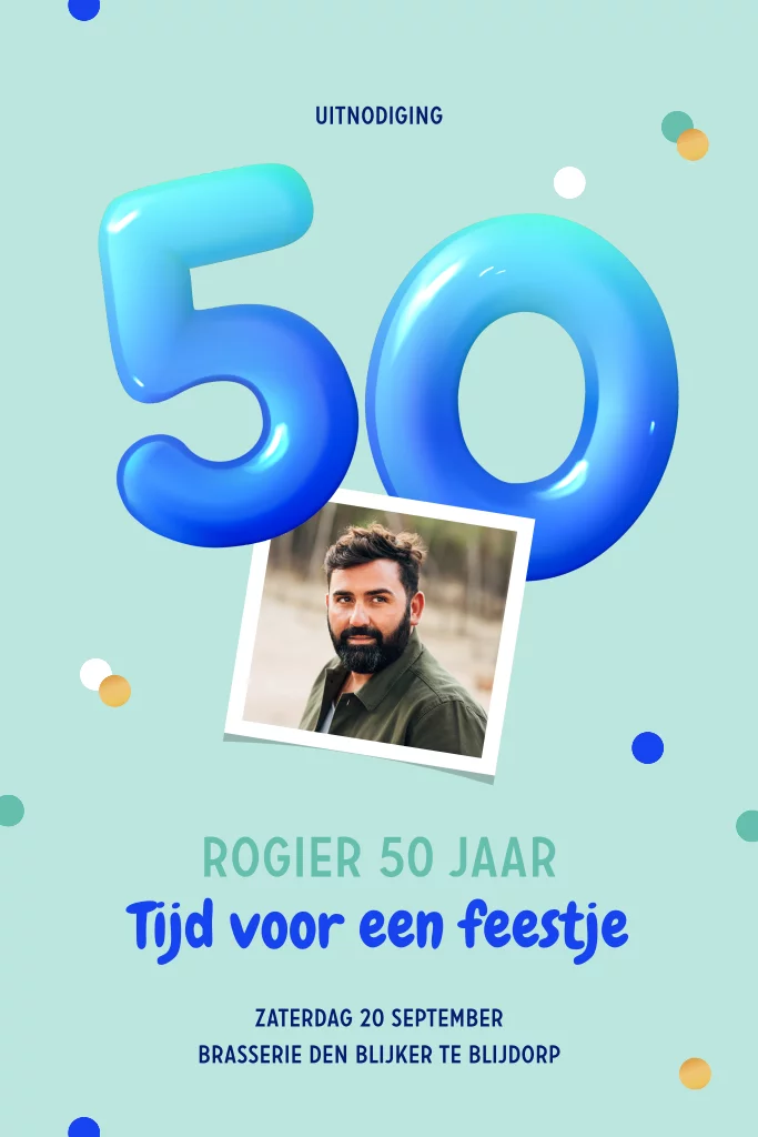 Feestje! Uitnodiging voor je 50e verjaardag. Op deze verjaardagsuitnodiging zie je het getal 50 in ballon foil staan met confetti op de achtergrond. Voeg een eigen foto van de jarige toe in onze online editor. De ronde hoeken zorgen voor een speels effect. Met de gouden envelop maak je deze spetterende uitnodiging helemaal in stijl af.