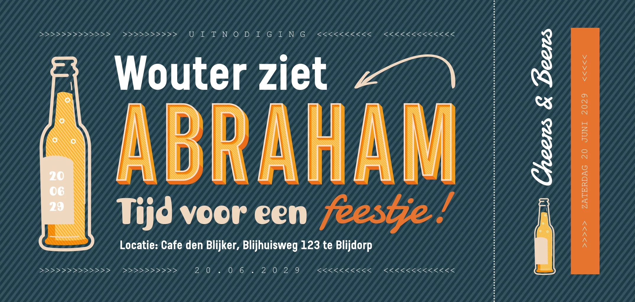 Zie jij Abraham? Dan is het tijd voor een feestje! Deze uitnodiging in ticketstijl met retro letters is hier helemaal geschikt voor. Nodig je vrienden en familie uit voor een cheers & beers met deze originele verjaardag uitnodiging.