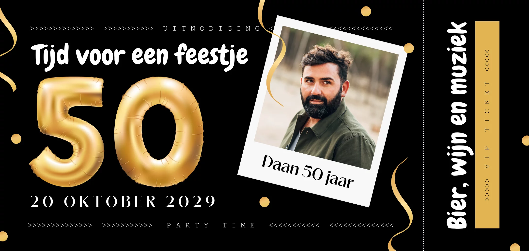 Abraham gezien? Hiep, hiep, hoera 50 jaar! Op deze ticket uitnodiging voor een man zie je het cijfer 50 geïllustreerd in ballon foil met daaromheen confetti. Pas op deze kaart de teksten en kleuren aan in onze online editor en voeg je eigen foto toe. Deze uitnodiging is vormgegeven in ticket stijl wat zorgt voor een speels effect. Maak er een onvergetelijk feestje van!