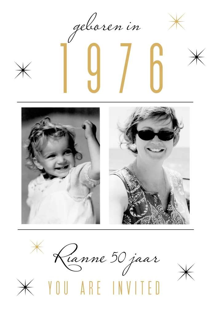 Verjaardagsuitnodiging voor een 50-jarige Abraham of Sarah. Het leuke aan deze kaart is de mogelijkheid om twee foto's te plaatsen. Een foto van vroeger en een foto van nu. Het jaartal staat prominent op de kaart en is natuurlijk aan te passen. Verder is de kaart versierd met sprankelende elementen en verschillende lettertypes.