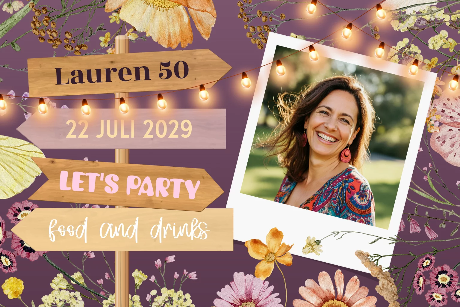 Feestelijke uitnodiging voor een vijftigjarige verjaardag met eigen foto. Op deze kaart staat een wegwijzer met tekst die eenvoudig zelf aan te passen is in onze online editor. De bloemenachtergrond, lampjes en de ronde hoeken zorgen voor een extra feestelijke uitnodiging. Nodig al je gasten uit met deze uitnodiging uit en maak er een prachtig feestje van.