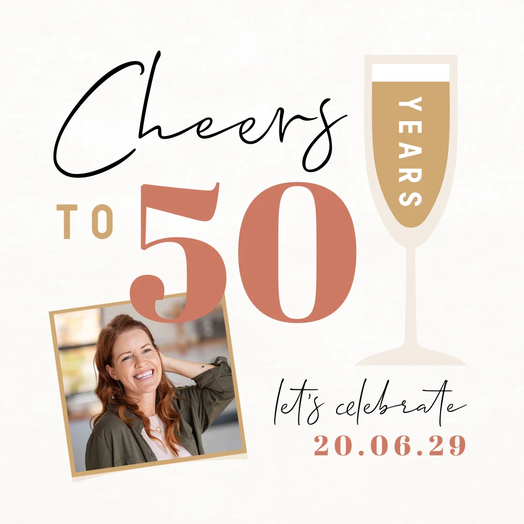 Sarah uitnodiging 50 jaar met champagneglas en eigen foto