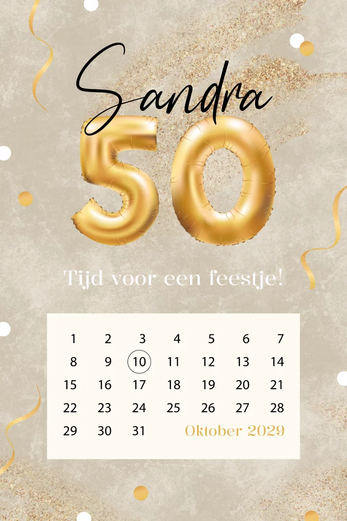 Sarah goudlook 50 jaar uitnodiging met kalender en cijfer ballon