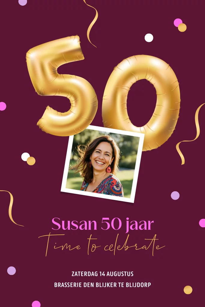 Goudlook ballon uitnodiging 50 jaar met foto en confetti