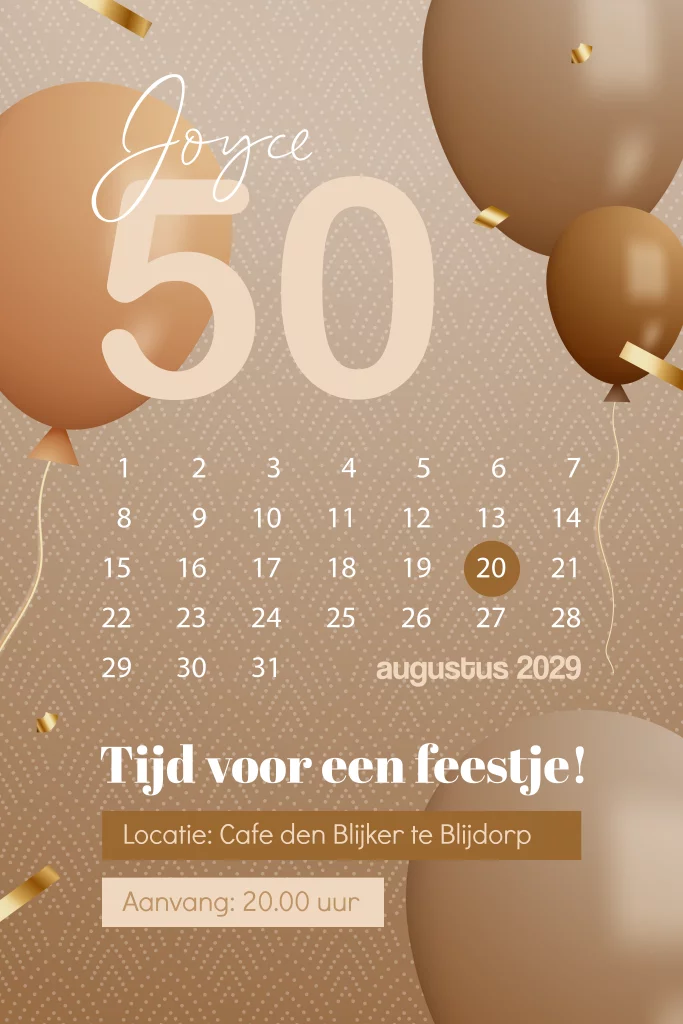 Wanneer je Sarah ziet en een feestje gaat vieren voor je 50ste verjaardag wil je je vrienden en familie natuurlijk uitnodigen met een geweldige uitnodiging. Op deze verjaardagsuitnodiging een kalender met op de achtergrond een retro stippen patroon. Het ontwerp is modern en chique. De ballonnen en confetti zorgen voor een feestelijke touch.