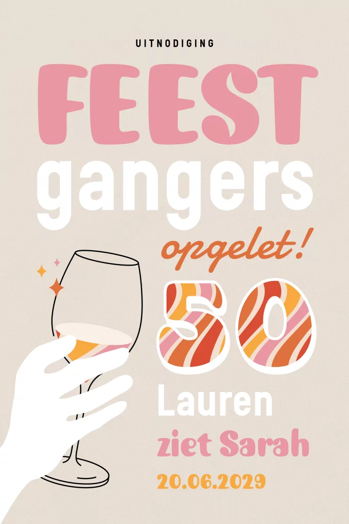 Feestgangers opgelet! Zie je binnenkort Sarah? Laat dit aan iedereen weten door ze uit te nodigen voor een feestje met deze retro verjaardag uitnodiging. Op deze typografische uitnodigingskaart kleurrijke lettertypes, wijn en in retrostijl het cijfer 50. Pas in de editor gemakkelijk de tekst en kleuren aan naar jouw wens.