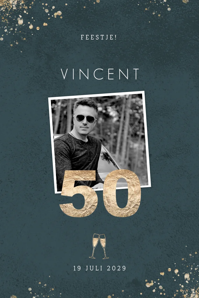 Hippe uitnodiging voor een 50e verjaardag met ruimte voor een eigen foto. Op de kaart staat de leeftijd in mooie gouden cijfers.