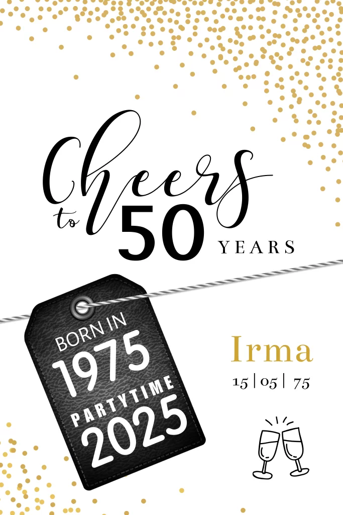 Uitnodiging voor een 50e verjaardag. Op deze verjaardagsuitnodiging staat vrolijke goudkleurige confetti en een leren label met de jaartallen. Deze kaart is gemakkelijk aan te passen naar een andere leeftijd en geschikt voor zowel een man als een vrouw.